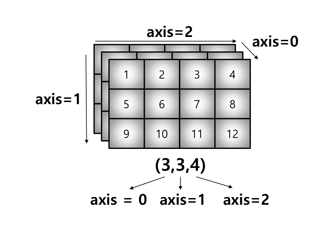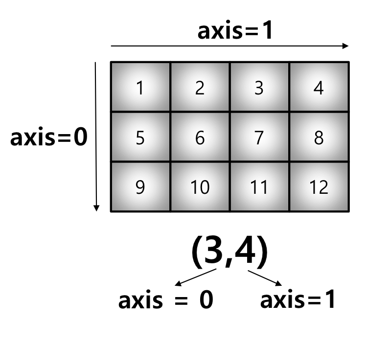 numpy에서는 shape의 0번째 원소는 axis=0, 1번째 원소는 axis=1...처럼 생각해야 한다.