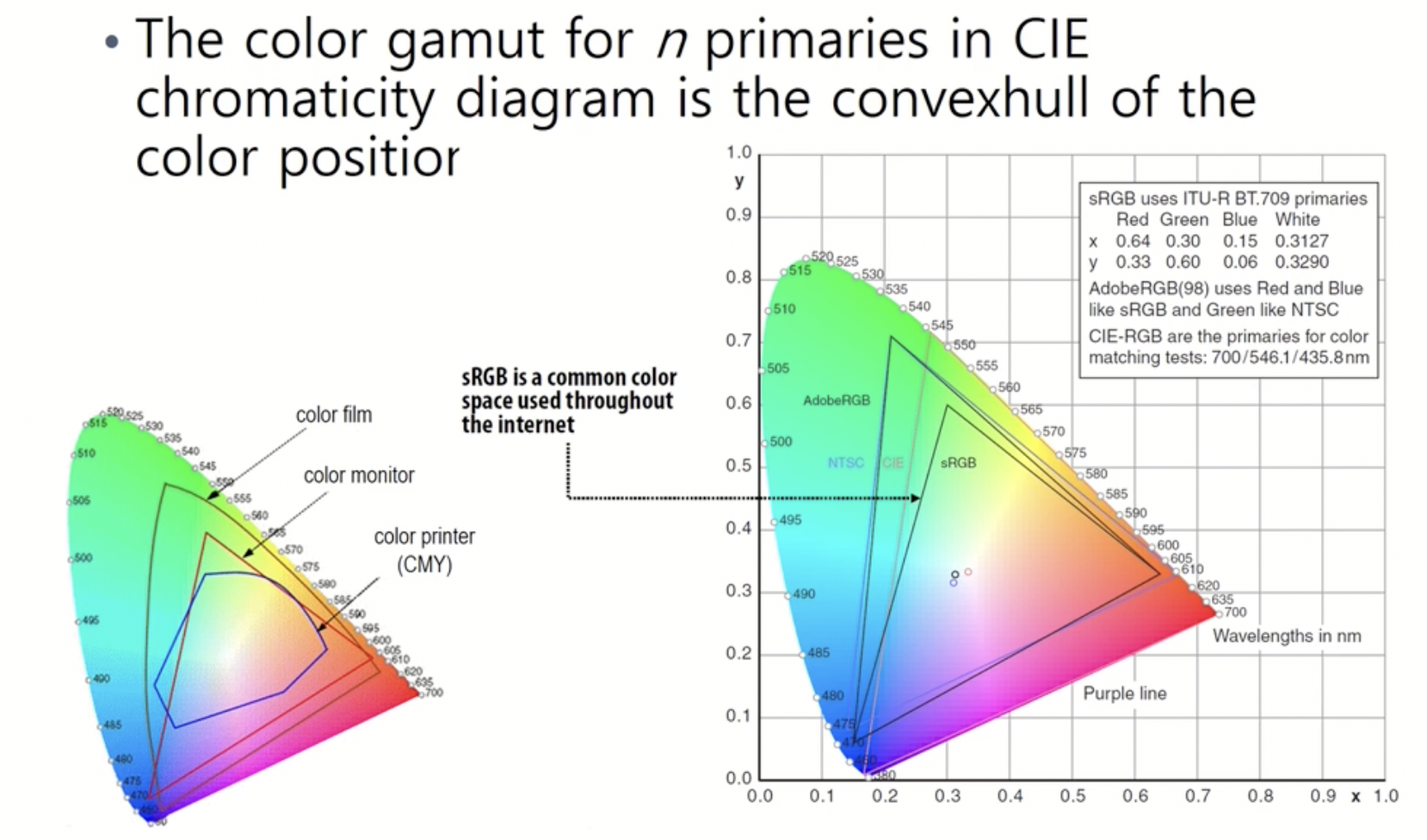 - 사용하는 color space에 따라서 표현할 수 있는 빛의 영역을 말한다.
