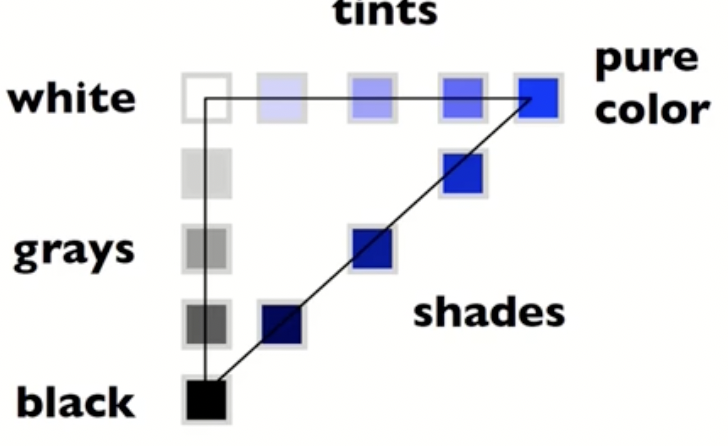 - pure blue에서 white와 black을 섞어서 tint, shade를 만든다.