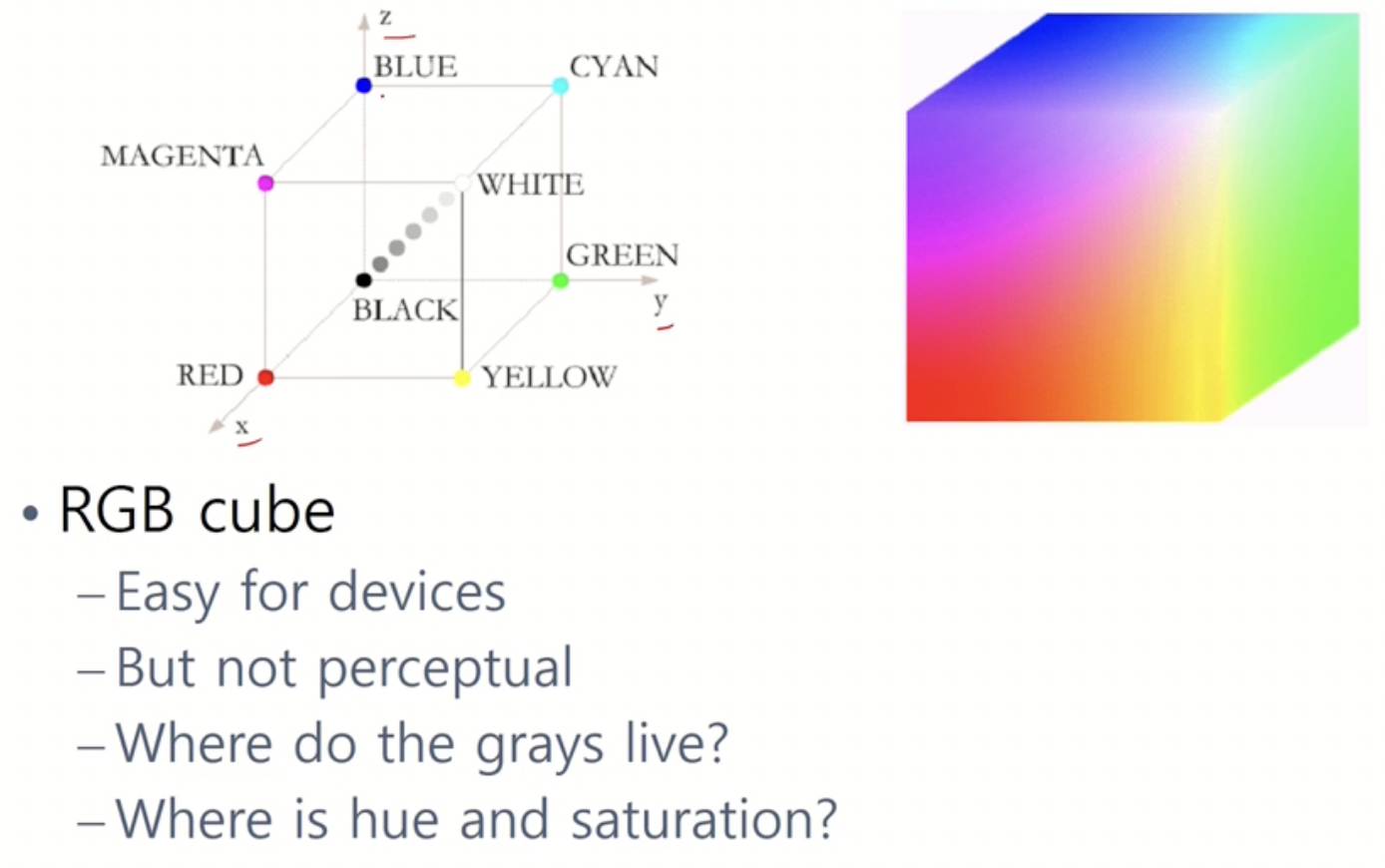 - 노랑을 빨강과 초록의 배합으로 표현하기 때문에 perceptual하지 않다.