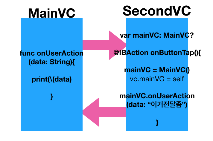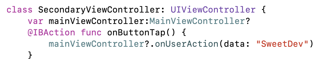 위에 예제에서 보듯, mainViewController의 프로퍼티에 self가 할당되었다. Secondary view controller는 이제 main view controller을 "알게"되고, mainVC의 함수들을 콜할 수 있게 된다 - 예제에서 onUserAction을 콜한것처럼!