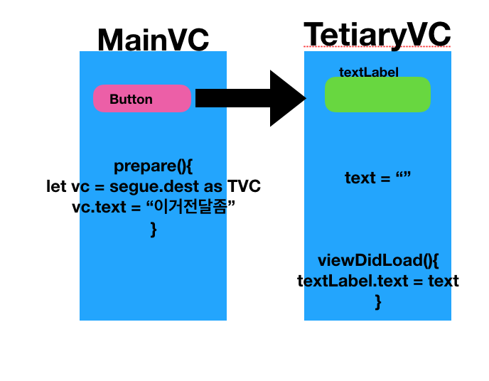 - view controller B(데이터를 받는 VC)에 프로퍼티를 만들어 준다. (위 예제에서는 텍스트)