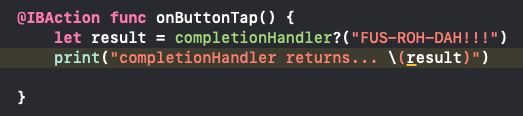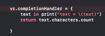 클로저에서 text 파라미터가 프린트 되었을 때, func의 결과로 string의 길이가 리턴된다. 여기가 흥미로운데, 클로저는 VC들 사이에서 쌍방으로 데이터를 주고 받을 수 있게 해준다. 클로저를 정의하고, 들어오는 데이터를 쓰고, 클로저를 유발한 애한테 다시 data를 돌려줄 수 있다.