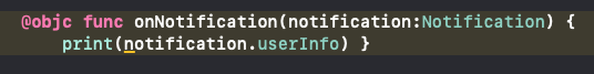 notification이 일어났을 때 call되는 함수는 onNotification(notification:)이고, 클래스에 추가해줘 보자!