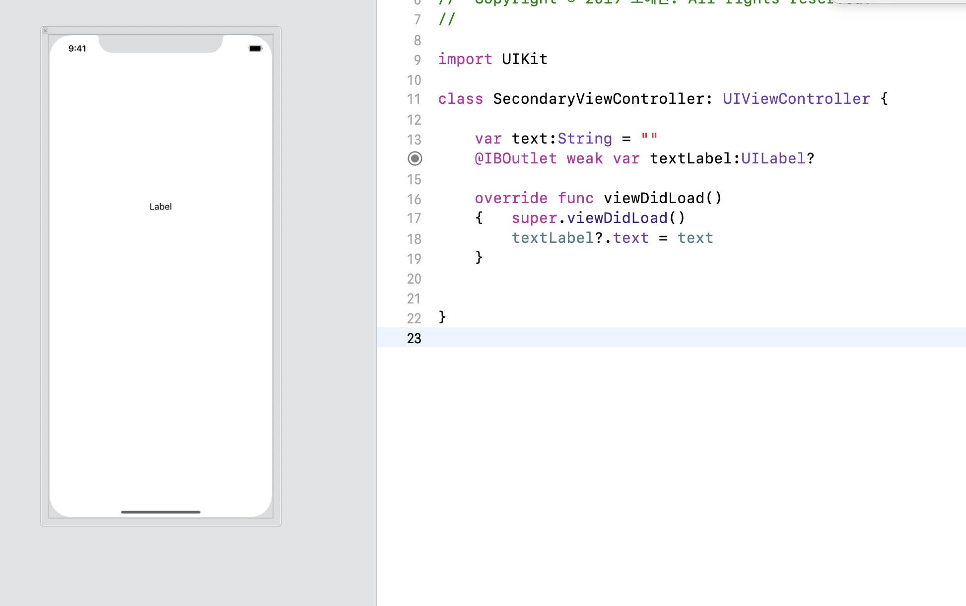 위에 코드에서 볼 수 있듯이, viewDidLoad() 안에 text의 값을 라벨에 넣는다! 라고 되어있다.