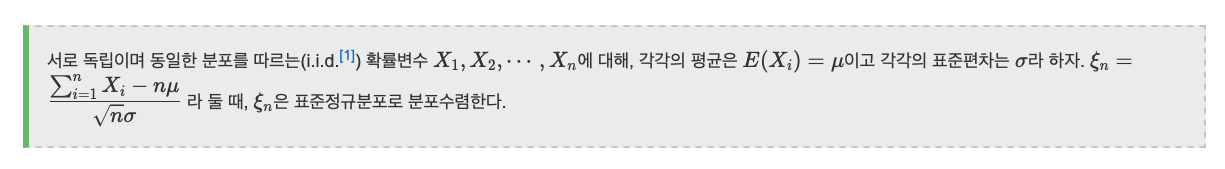 서로 독립이며 동일한 분포를 따르는 확률변수 $X_1,X_2,⋯ ,X_n$에 대해, 각각의 평균은 $E(X_i)=\mu$이고 각각의 표준편차는 $\sigma$라 하자. $S_n = X_1 + ... + X_n$ 이면, $\frac{S_n - n\mu} {sigma root(n)}$ 은 N(0,1)을 따른다.