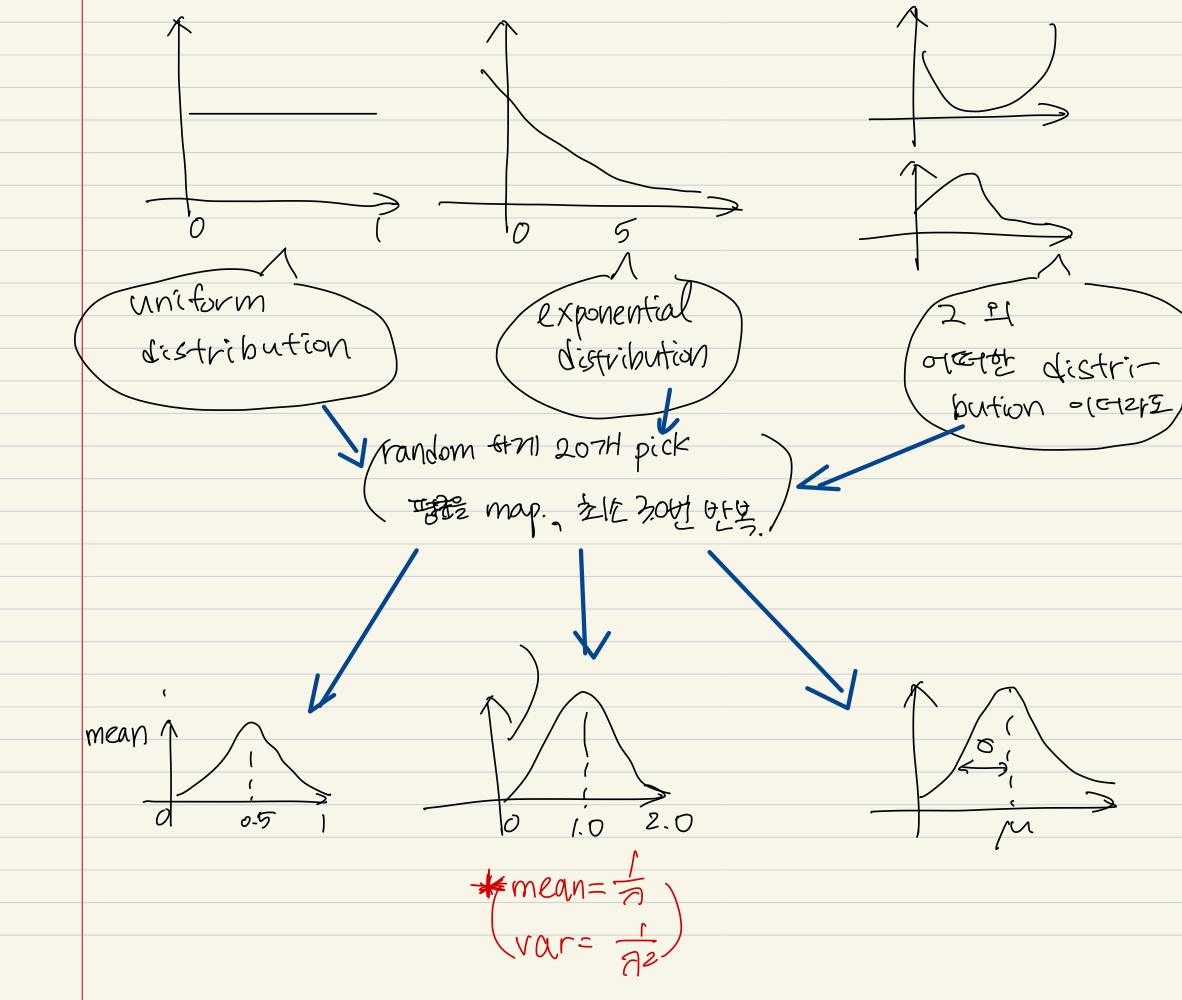 중심 극한 정리는, 어떠한 분포라도 그 분포에서 random하게 N개의 sample을 고르고, 그 평균을 기록하는것을 30번 이상 반복하면