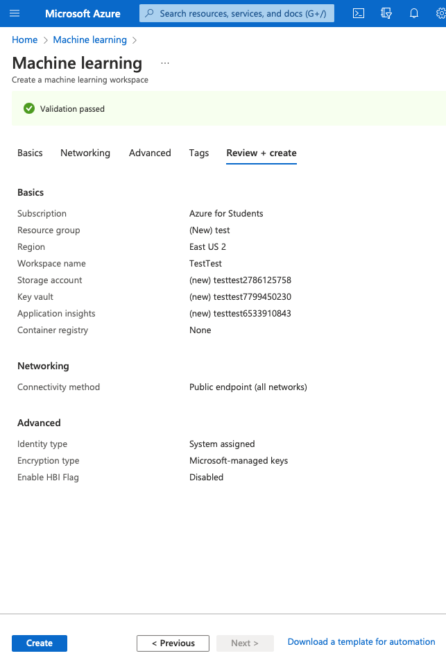 Machine Learning으로 검색해서 machine learning workspace를 만들어 준다.