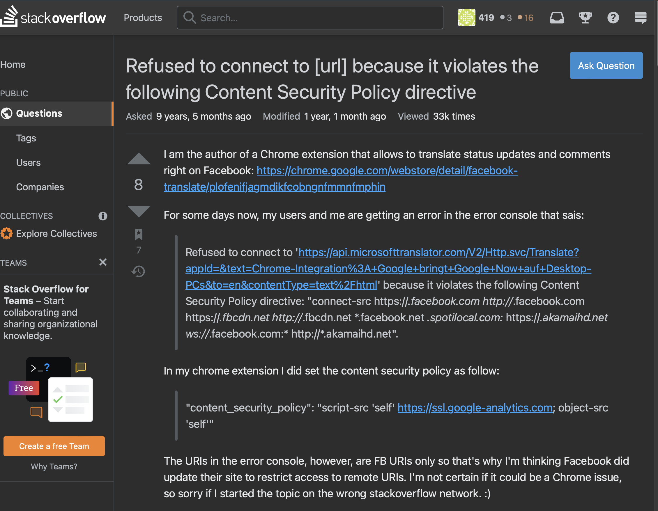 [ChromeExtensionDev] "Refused to connect to '{URL}' because it violates the document's Content Security Policy." 해결하기