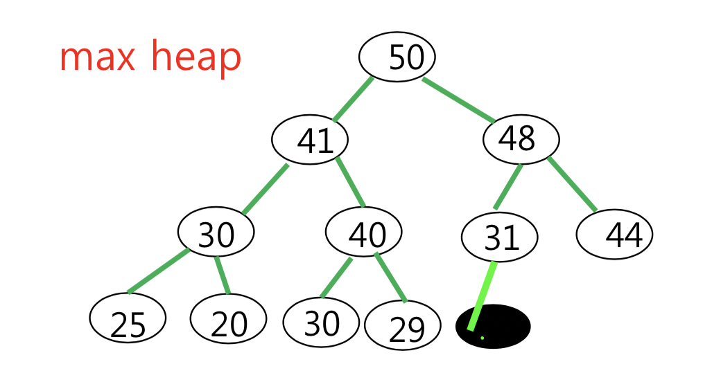 예를 들어서 생각해보자! 새로운 원소가 30이라면, 바로 저 자리에 넣으면 된다. 그러나 값이 49이면 넣을 수 없다. 그러므로 31을 검은색 위치에 넣고, 최대 힙이 되는지 본다. 여전히 안 된다. 그럼 48을 그 자리에 넣는다. 여전히 안된다. 51을 그 자리에 넣는다. 이제야 된다!