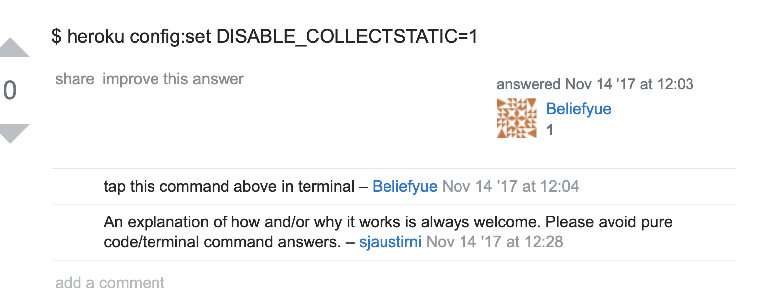 heroku config:set DISABLE_COLLECTSTATIC=1 라고 터미널에 치니까 딱 됐다!!!