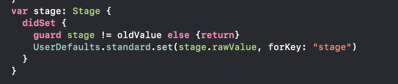 stage 값이 바꼈을 때, 기존의 stage값 (oldValue)랑 값이 다르면 UserDefault에서 값을 바꿔준다.