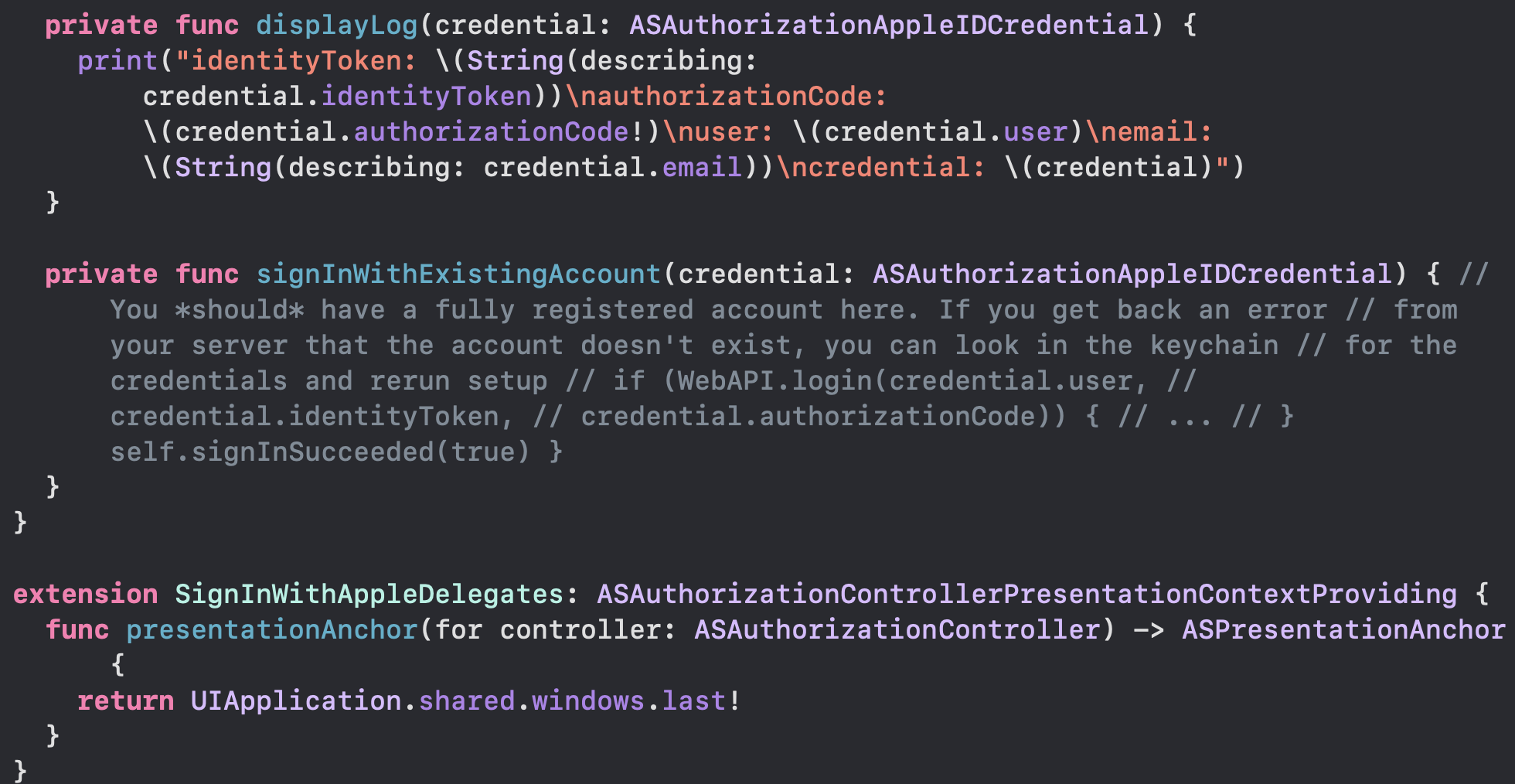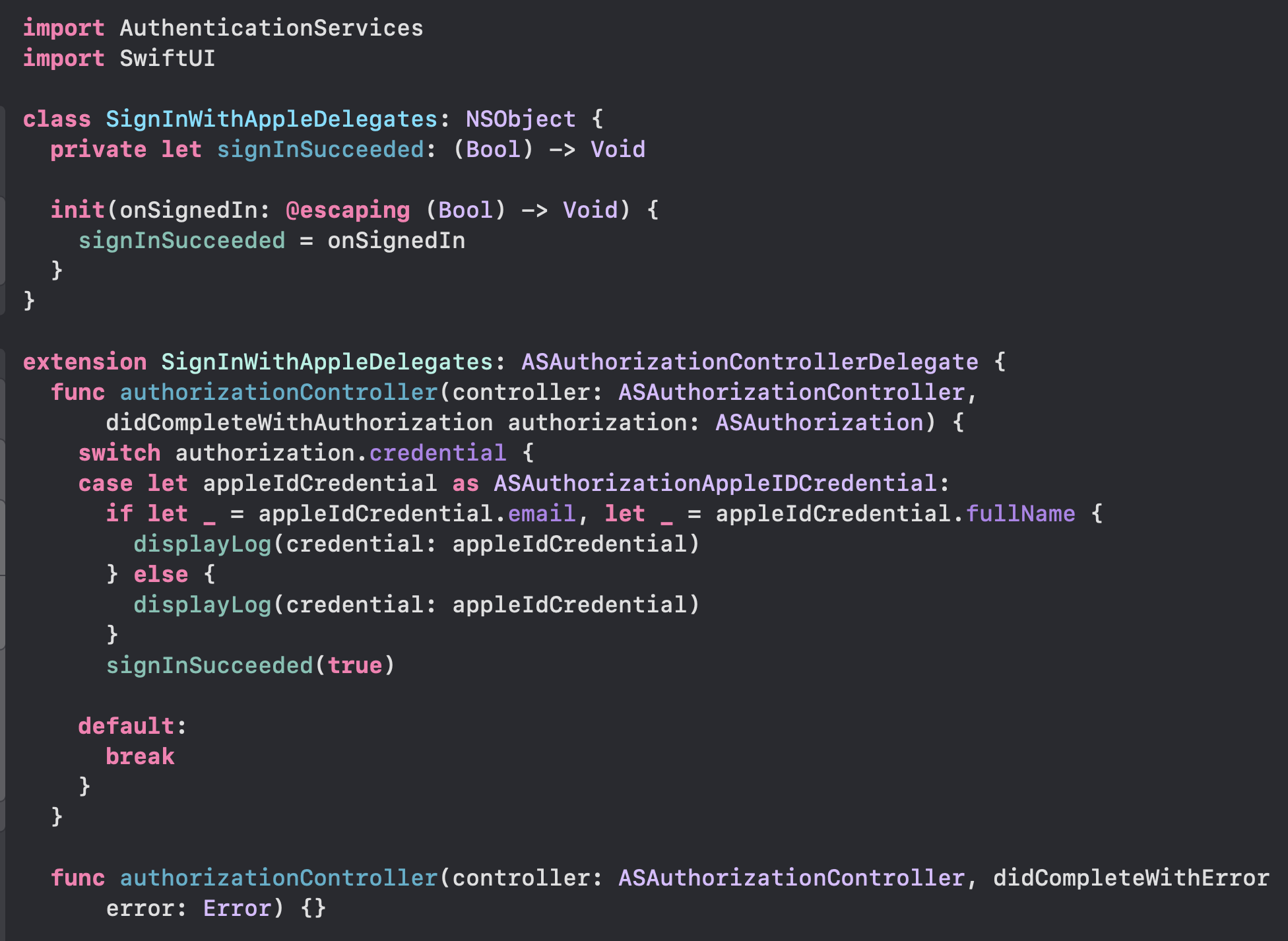 3. SignInWithAppleDelegate 클래스를 만들고, 이렇게 코드를 작성해준다.