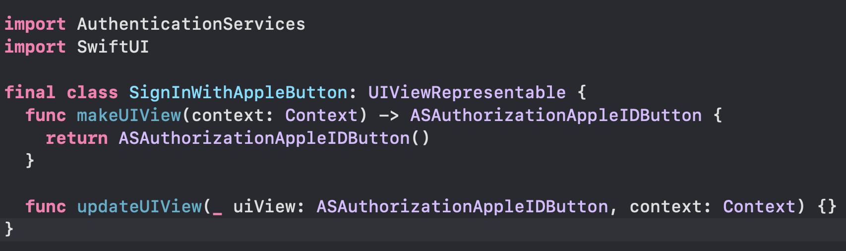 2. 새로운 클래스 SignInWithAppleButton을 만들고, 다음과 같이 작성한다.