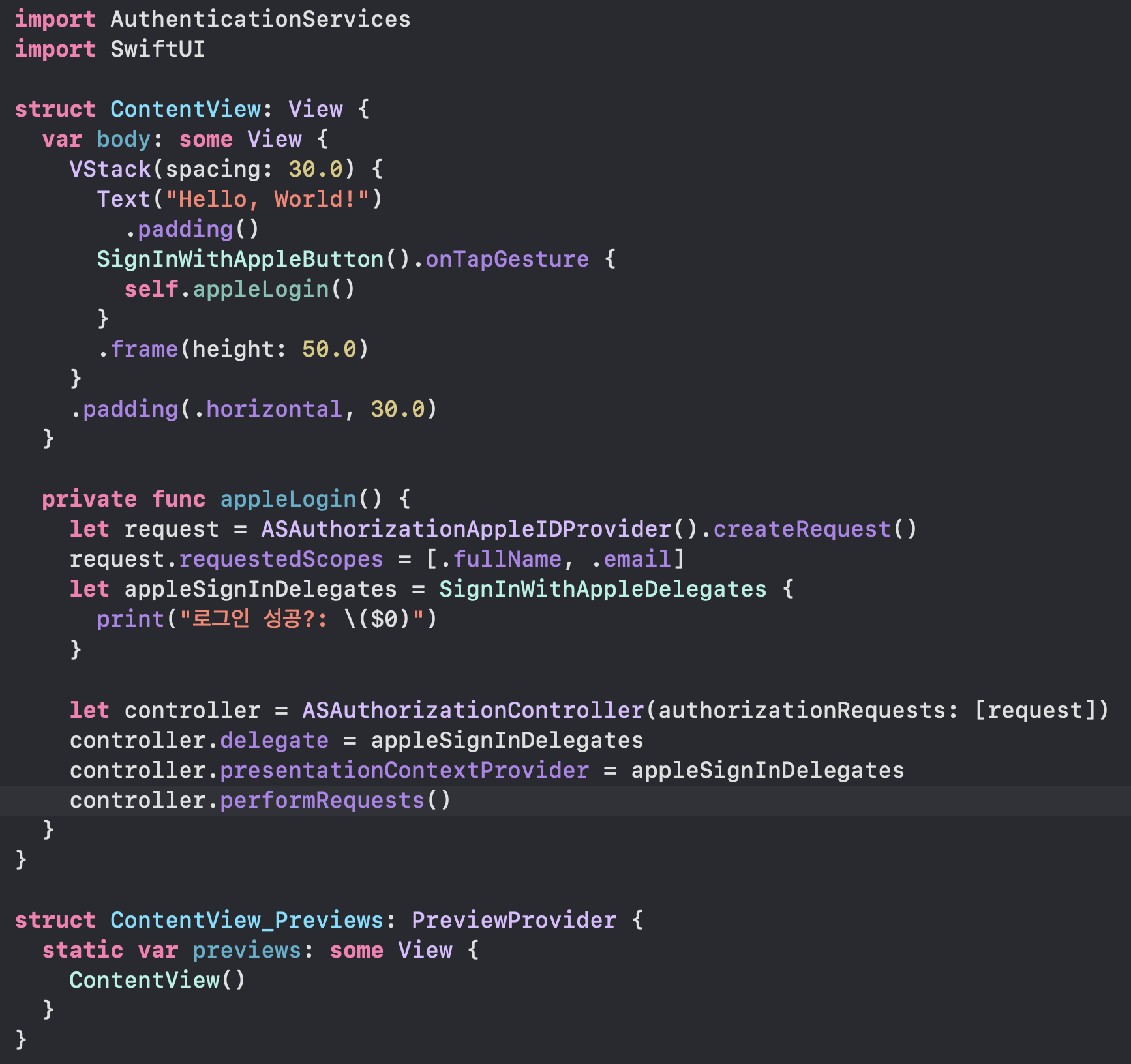 appleLogin함수는, SignInWithAppleDelegate 인스턴스를 만들고 새로운 Controller을 만들어서 delegate 채택까지 해준다.