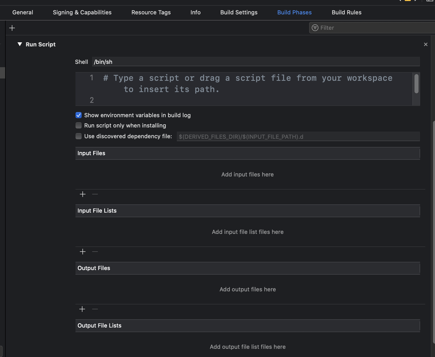 Editor > Add Build Phase > Add Run Script Build Phase 를 누른다.