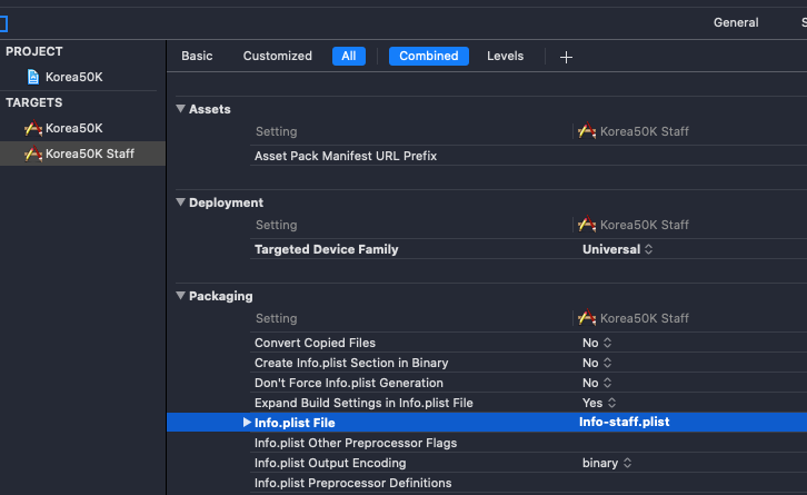 plist파일의 이름을 바꿔주었으니, Target의 Build Settings에서도 plist 파일의 이름을 바꿔주어야 한다.
