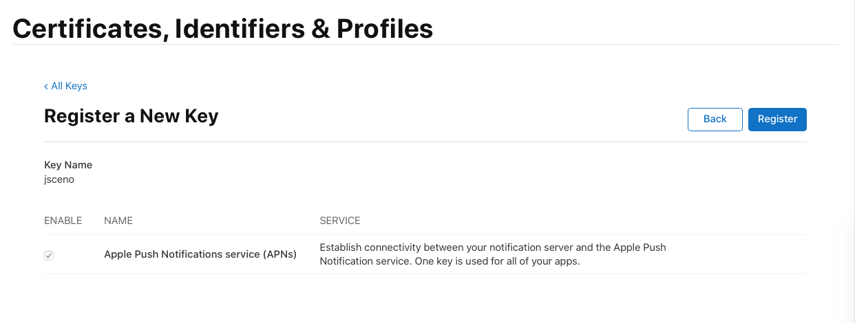 - 애플 개발자 페이지에서 APN 인증키를 다운로드 받는다. Keys에서 +를 누르고, APNs에 체크 해서 p8파일을 만들어준다.