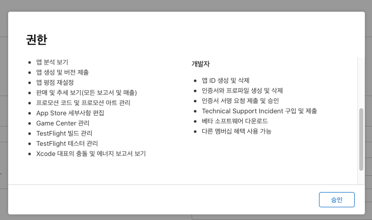 애플 개발자 페이지 에서 Certificates, Identifiers & Profiles 탭에서 좌측 Keys를 눌러서 접근하면 된다. Keys가 뜨지 않는다면, 계정 owner에게 ‘관리’ 권한을 달라고 해야한다. ‘제품 개발’이나 ‘마케팅’, ‘재정 관리’ 같은 role에는 인증서에 접근할 권한이 없다.