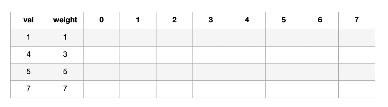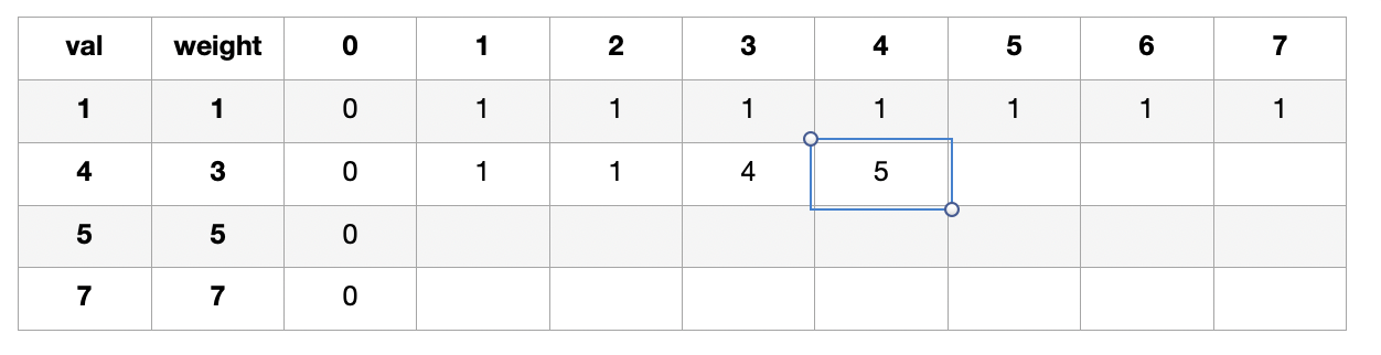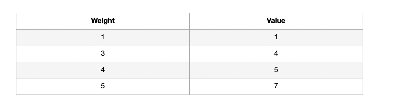 그리고 나에게는 한개의 가방이 있는데, 이 가방에는 최대 7만큼의 weight만 들어갈 수 있다. 내가 넣은 물건들의 value의 합이 최대가 되게 하려면, 어떤 어떤 물건들을 넣어야 할까???