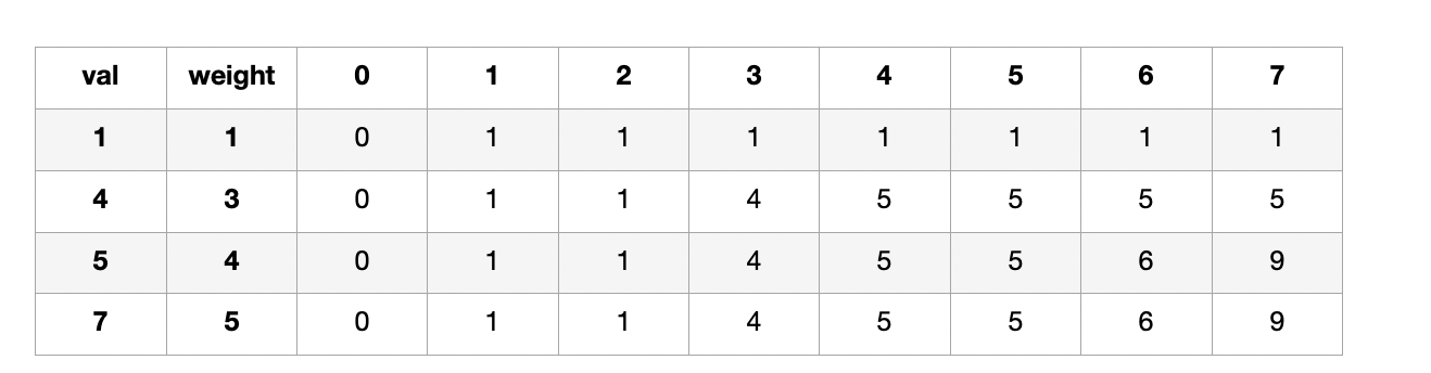 K[i][w] = max(val[i-1] + K[i-1][w-wt[i-1]], K[i-1][w])