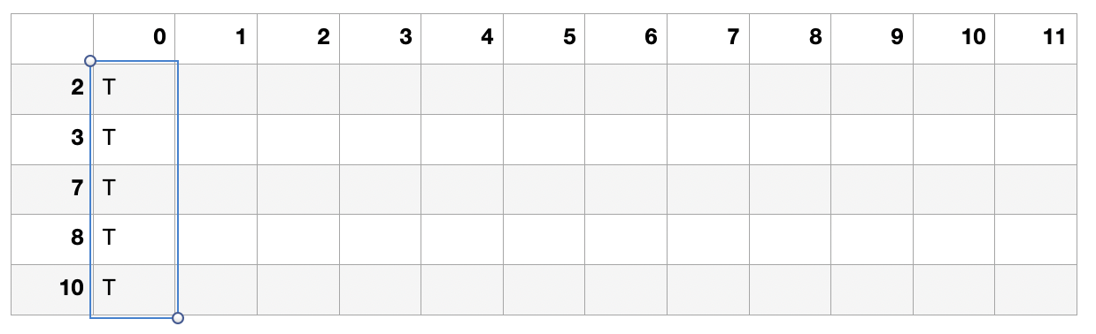 2, 3, 7, 8, 10을 0개씩 쓰면 합이 0이 될 수 있으므로 첫 줄을 다 T로 채워준다.