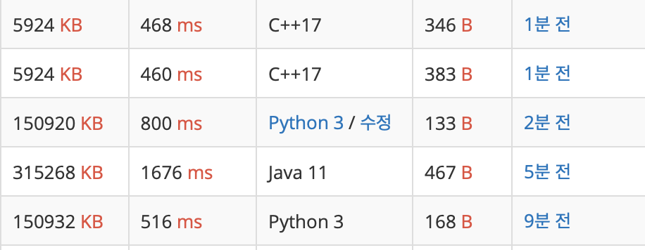 근데 보니까 메모리랑 런타임이 너무 길다. list로 짜서 그런가...
