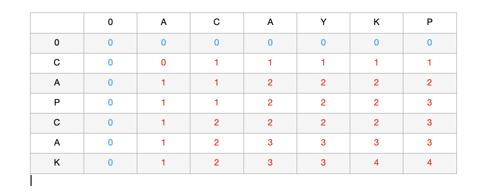 글자가 같을때는 그 전줄전의값 + 1 해서 넣어주면 되는데, 다를때는 윗줄과 옆칸을 비교해서 더 큰값을 넣어준다.