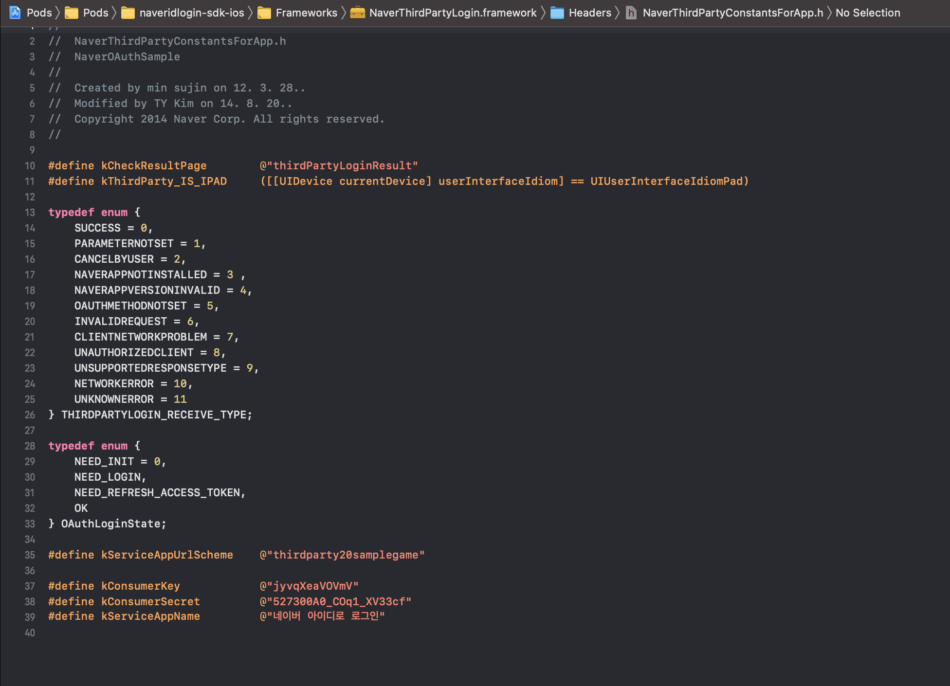 NaverThirdPartyConstantsForApp.h 파일의 변수들을 바꿔줘야 한다. 이 파일을 못찾아서 한참 헤맸는데,