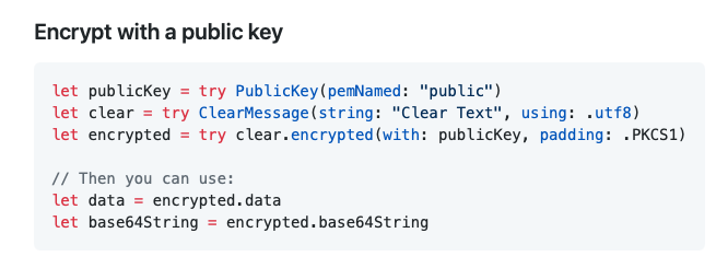 let encrypted = try! clear.encrypted(with: publicKey, padding: .PKCS1)