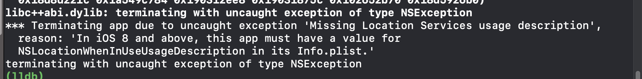 그런데 Privacy - Location Always Usage Description로 했더니, 이러한 에러가 났다. Always로는 쓸 수 없다는건가..? (혼란)