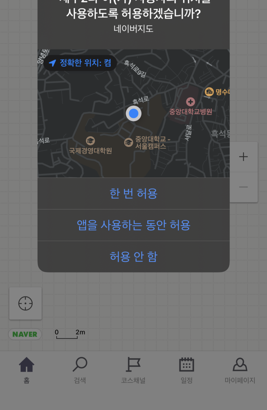 하니까 지도가 뜨는 뷰로 들어갈 때 권한을 물어봤다.