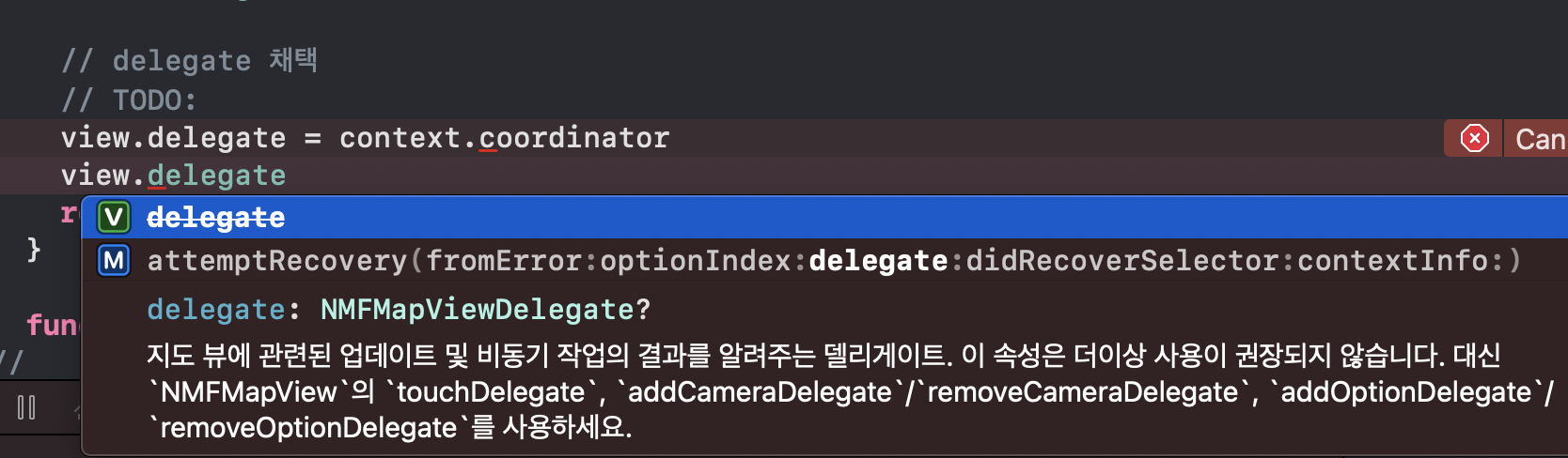 기존에 하던 방식으로 delegate사용을 위해서 context.coordinator을 전달해주려고 했더니 에러가 발생했다.