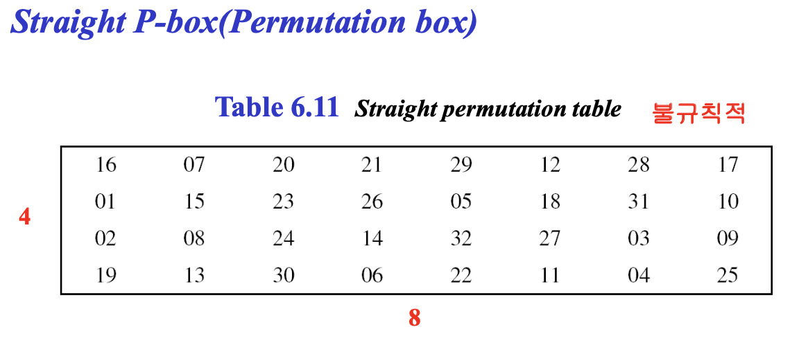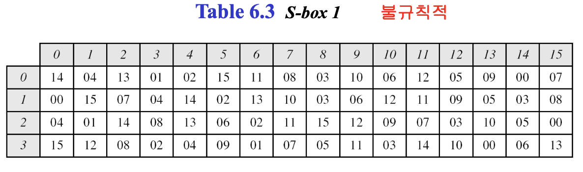 참고로 S-box는 알고리즘을 설계한 사람이 만든거다. 우리 맘대로 바꿀 수 없다!! 설계된 테이블을 갖다 써야한다. 또, S-box를 설계한 사람은 설계 아이디어, 이유 등은 설명하지 않았다.