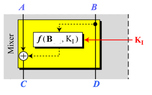 오른쪽 그림의 과정을 16번 반복하게 된다. 64-bit의 input을 32bit씩 잘라서, 오른쪽 파트는 그대로 왼쪽으로 가고 왼쪽 파트는 F함수를 거쳐서 오른쪽으로 붙는다. 이 F함수(Mixer)가 DES의 핵심이다.