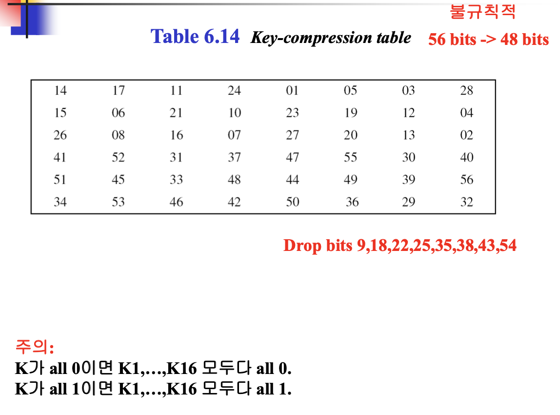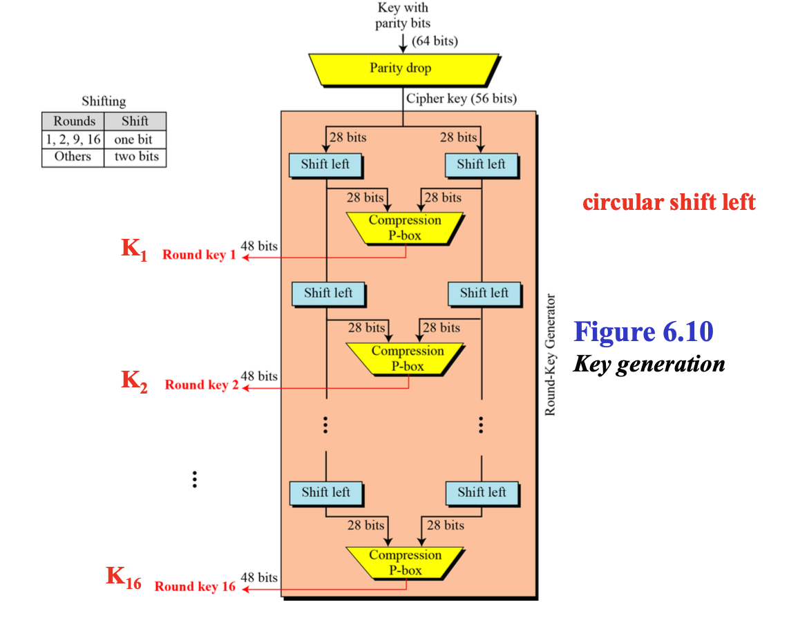 cipher key에 대해서 parity bit를 더해서 64비트를 만들어주고, Parity drop을 하고, circular shift left하고, Compression P-box를 해서 키를 완성한다.