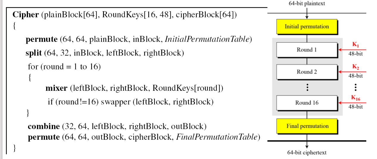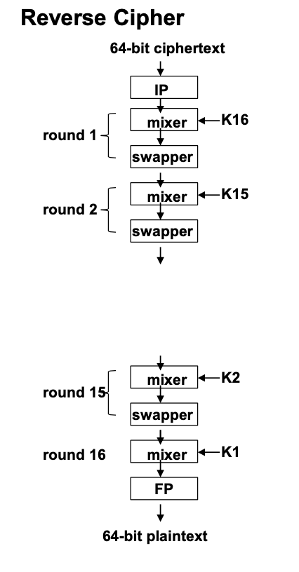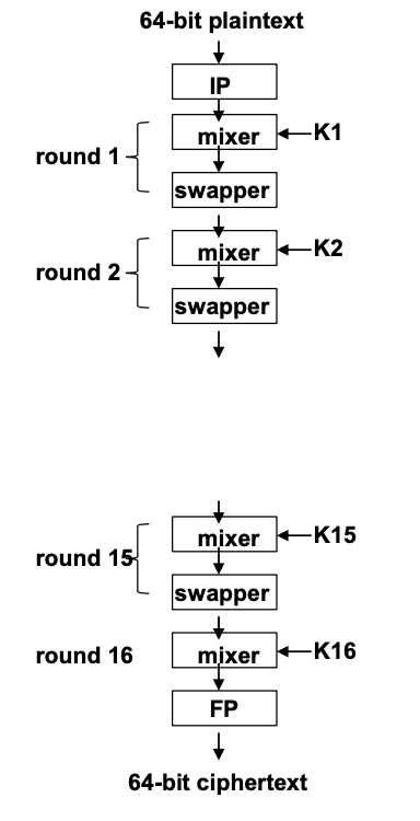 16번의 Feistel함수를 하면서, 마지막 16번째 라운드만 살짝 다른 방식을 취해준다. mixer만 있고, swapper은 없다는 점이다.