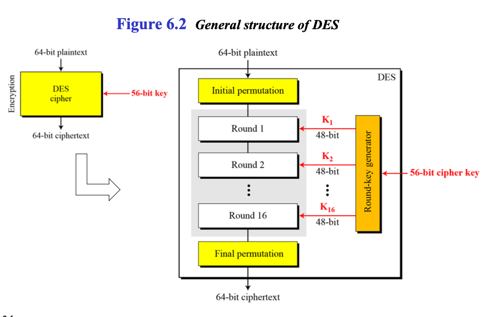 DES는 64비트의 평문을 가지고 64비트의 암호문을 생성한다. 이때 동일한 56비트의 암호키(cipher key)가 암호화, 복호화 과정에 모두 사용된다.