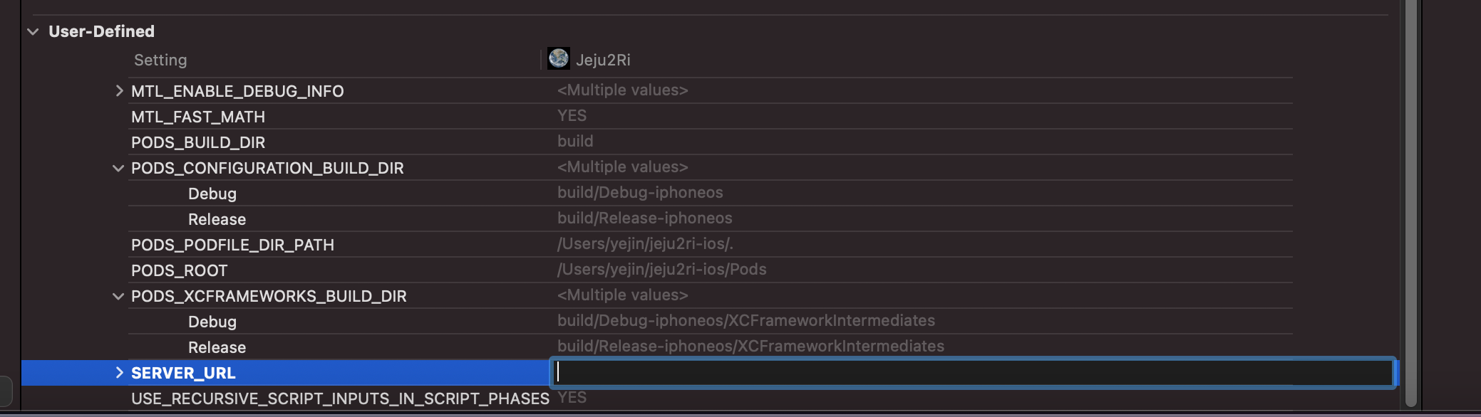Build Settings > Target으로 가서, +를 눌러서 Add User-Defined Setting 해준다.