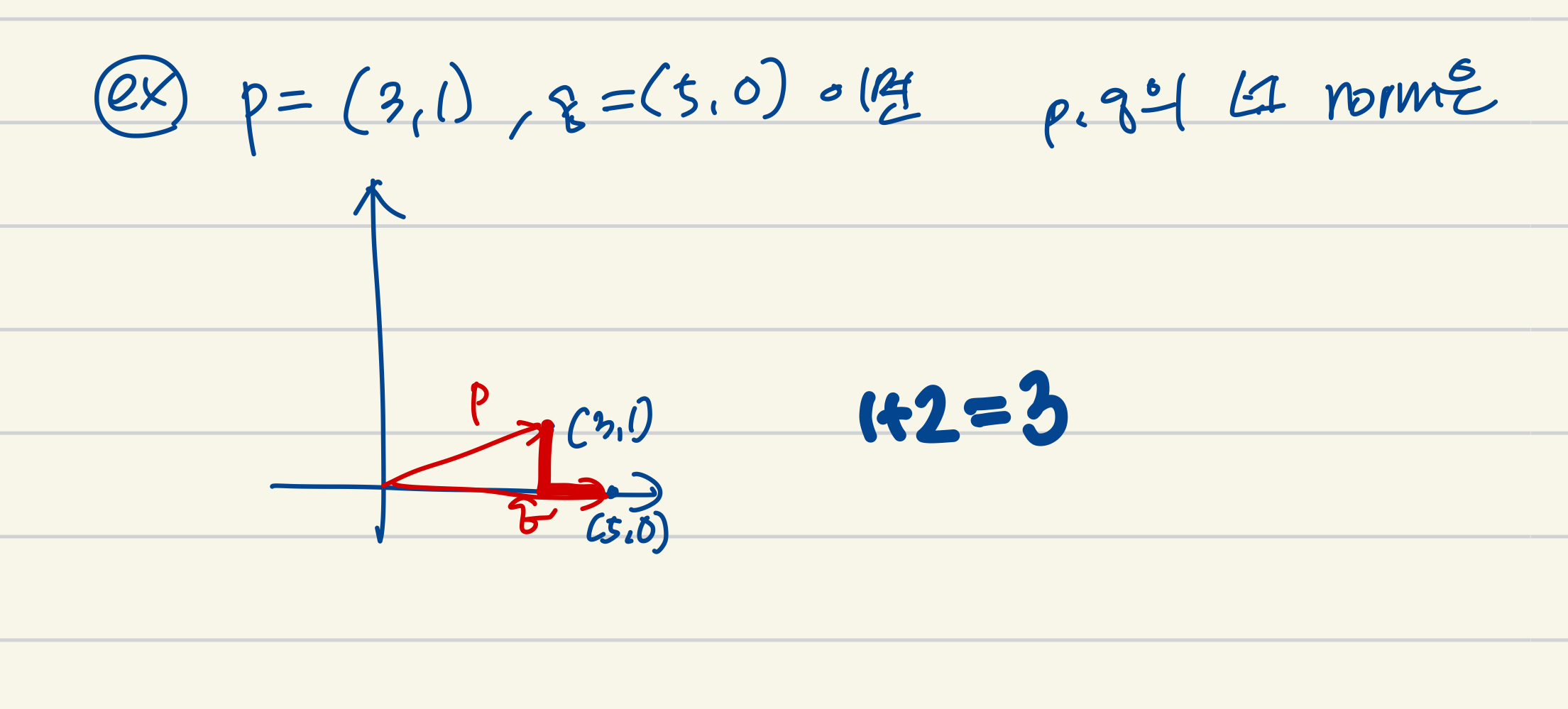 $ d_1 (p, q) = ||p-q|| = \sum_{i=1}^n{|p_i - q_i|}$, where $(p, q)$ are vectors $p=(p_1, ..., p_n)$ and $q=(q_1, ..., q_n) $