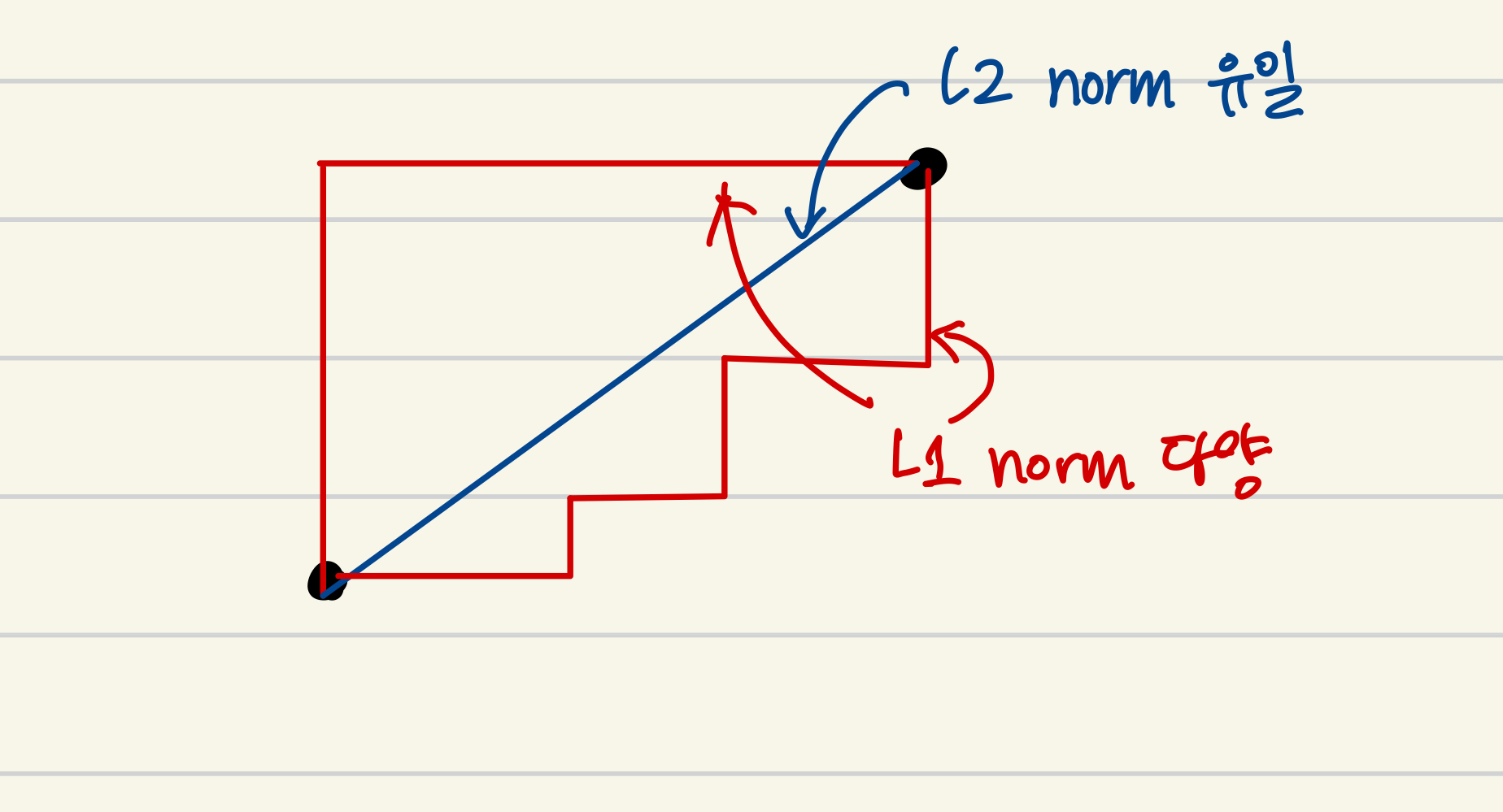 거리가 같게 떨어진 점을 모았을 때 L1은 마름모꼴이, L2는 원이 나온다.