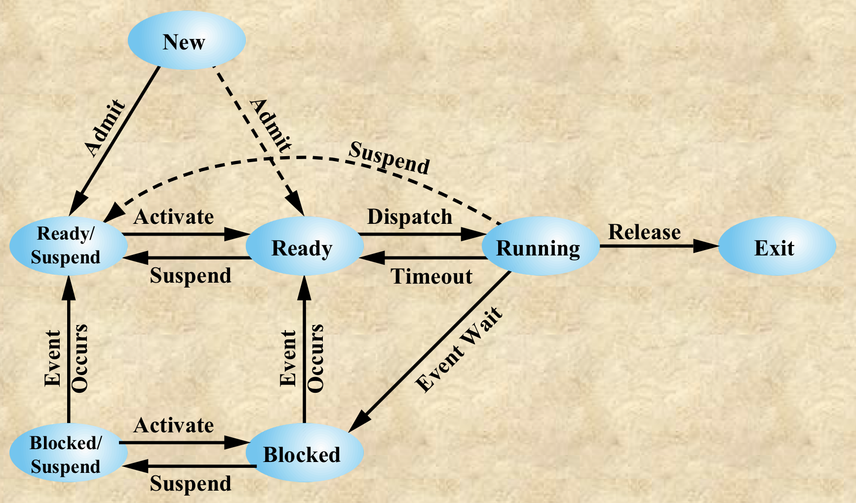 Swapping: ready상태의 process가 하나도 없다면, 너무 오랫동안 waiting 상태에 있었던 process를 메인메모리에서 디스크의 suspend queue에 넣어버린다.