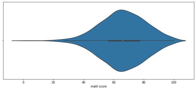 sns.violinplot(x='math score', data=student, ax=ax)