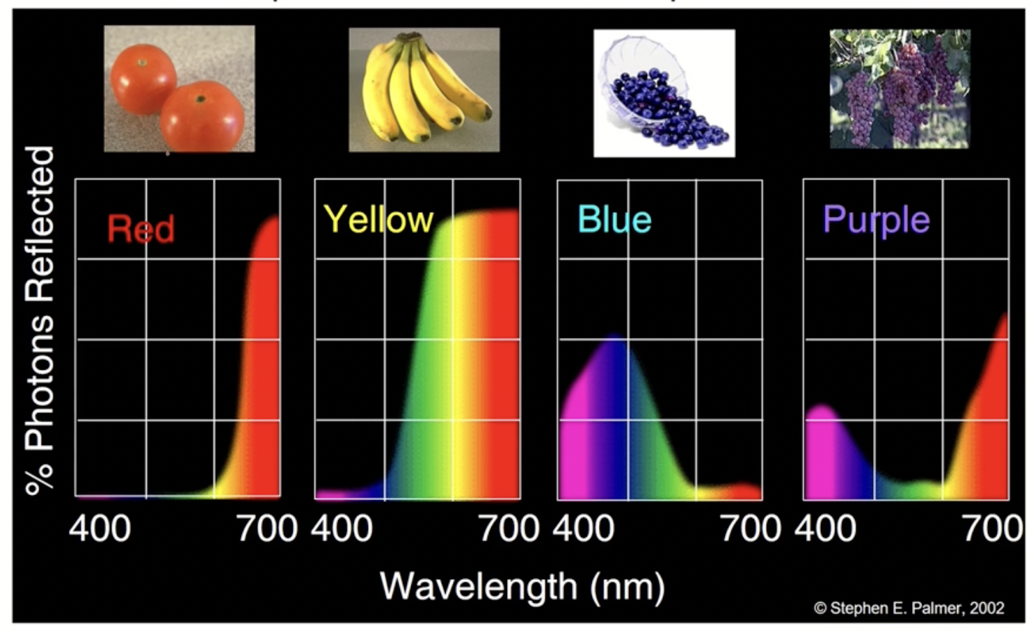 - 실제 물체 표면의 reflectance를 살펴보자. 토마토는 빨간색 파장의 반사정도가 집중되어있다.