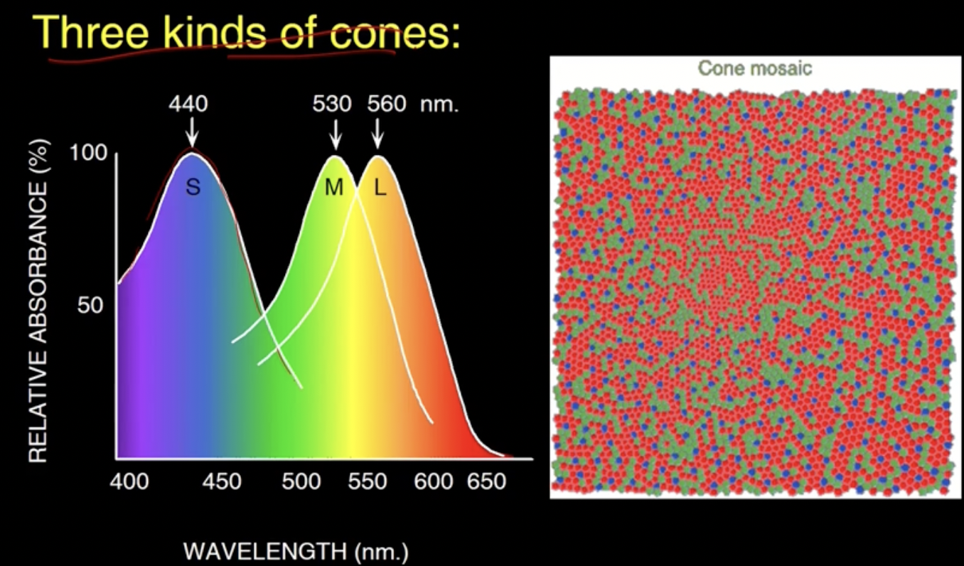 - 오른쪽 그림은 평균적으로 세 cone의 개수 분포를 나타낸다. 붉은색이 제일 많다.