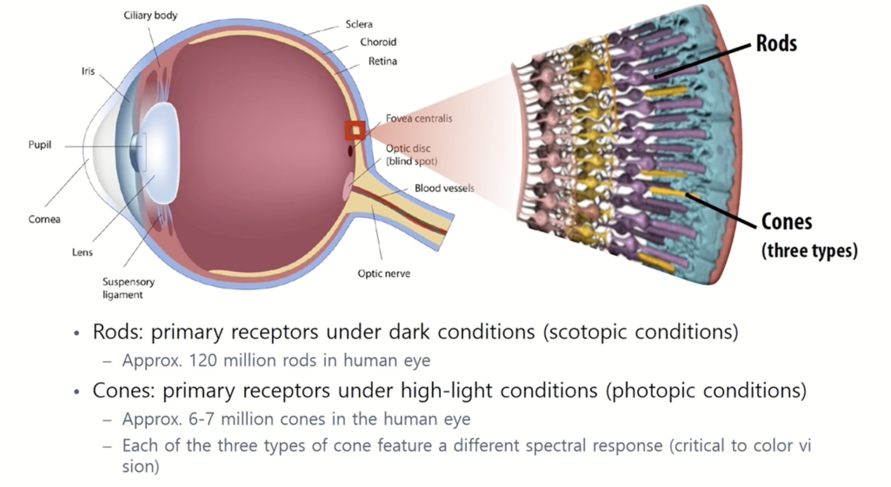 - 크게 두종류의 시각 세포가 감지를 한다. Rods는 밝기(빛의 양)를 감지하고 Cones는 빛의 색을 감지한다.