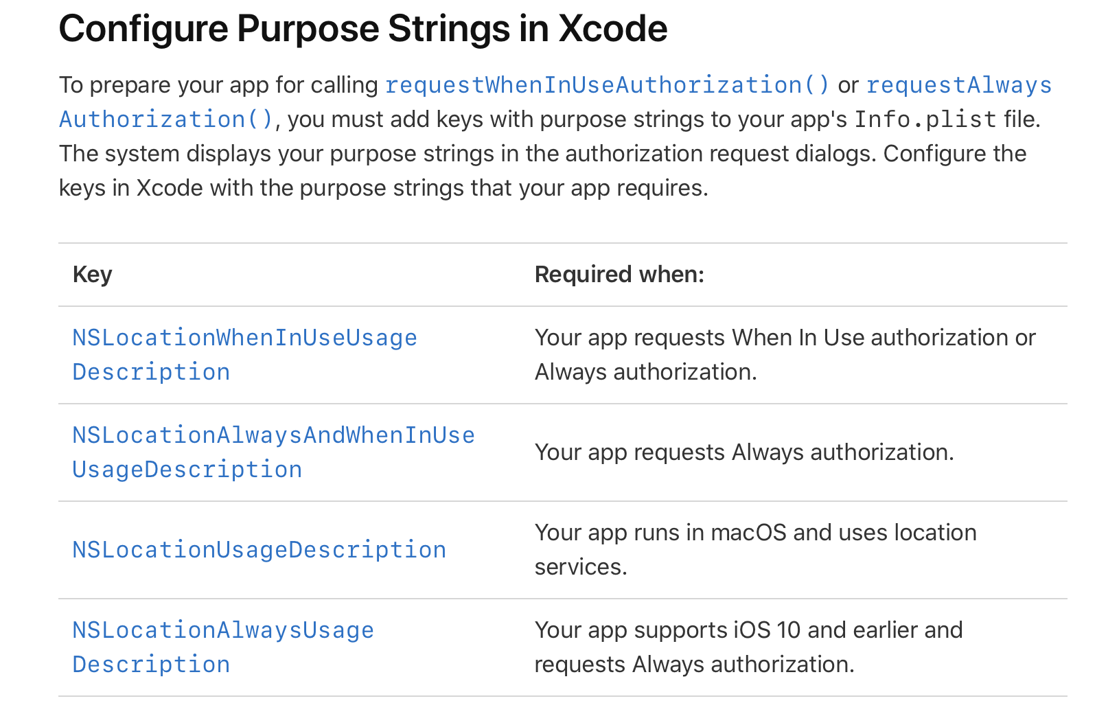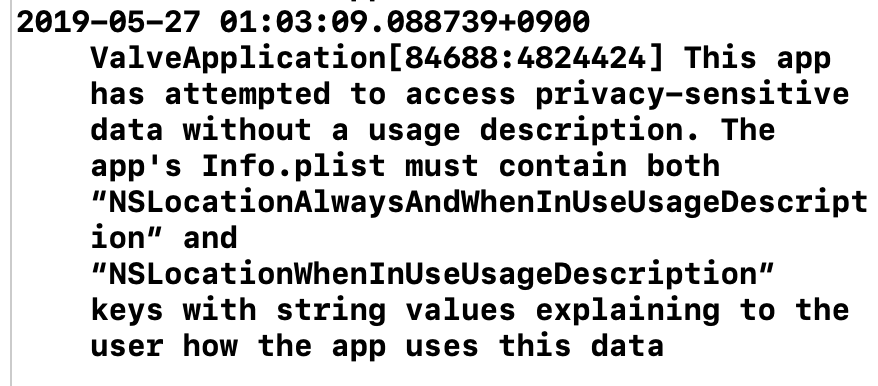 이 경우에는 키를 NSLocationWhenInUsageDescription으로 해야함