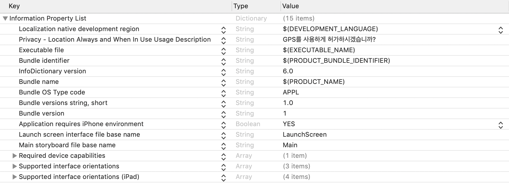 Info.plist의 Information Property List의 딕셔너리에 key-value값 추가해주기