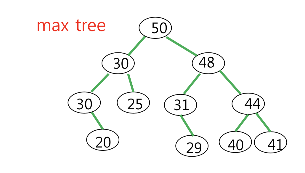 max tree는, 각 노드의 키 값이 (자식이 있다면) 그 자식의 키값보다 작지 않은 트리이다.