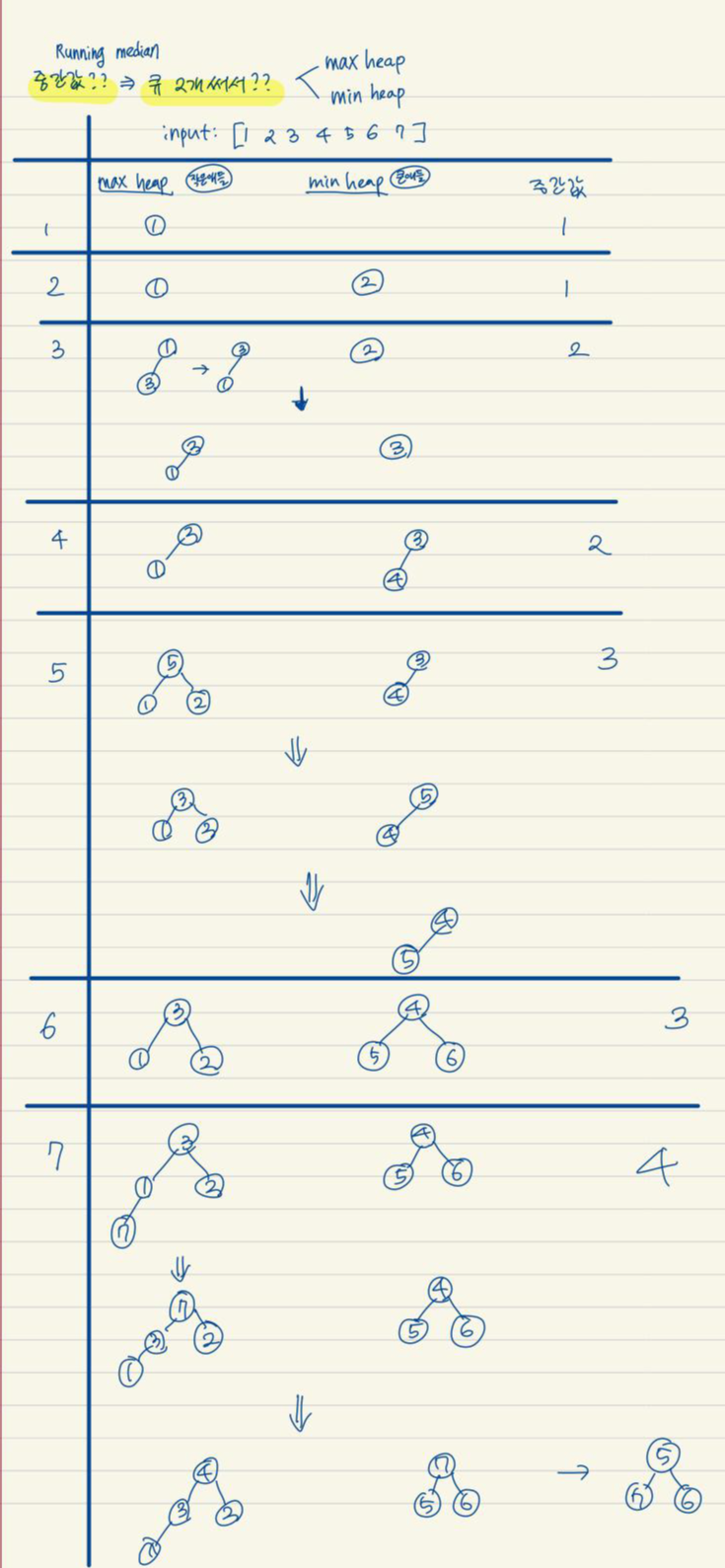 앞의 절반을 최대 힙, 뒤의 절반을 최소 힙에 넣음